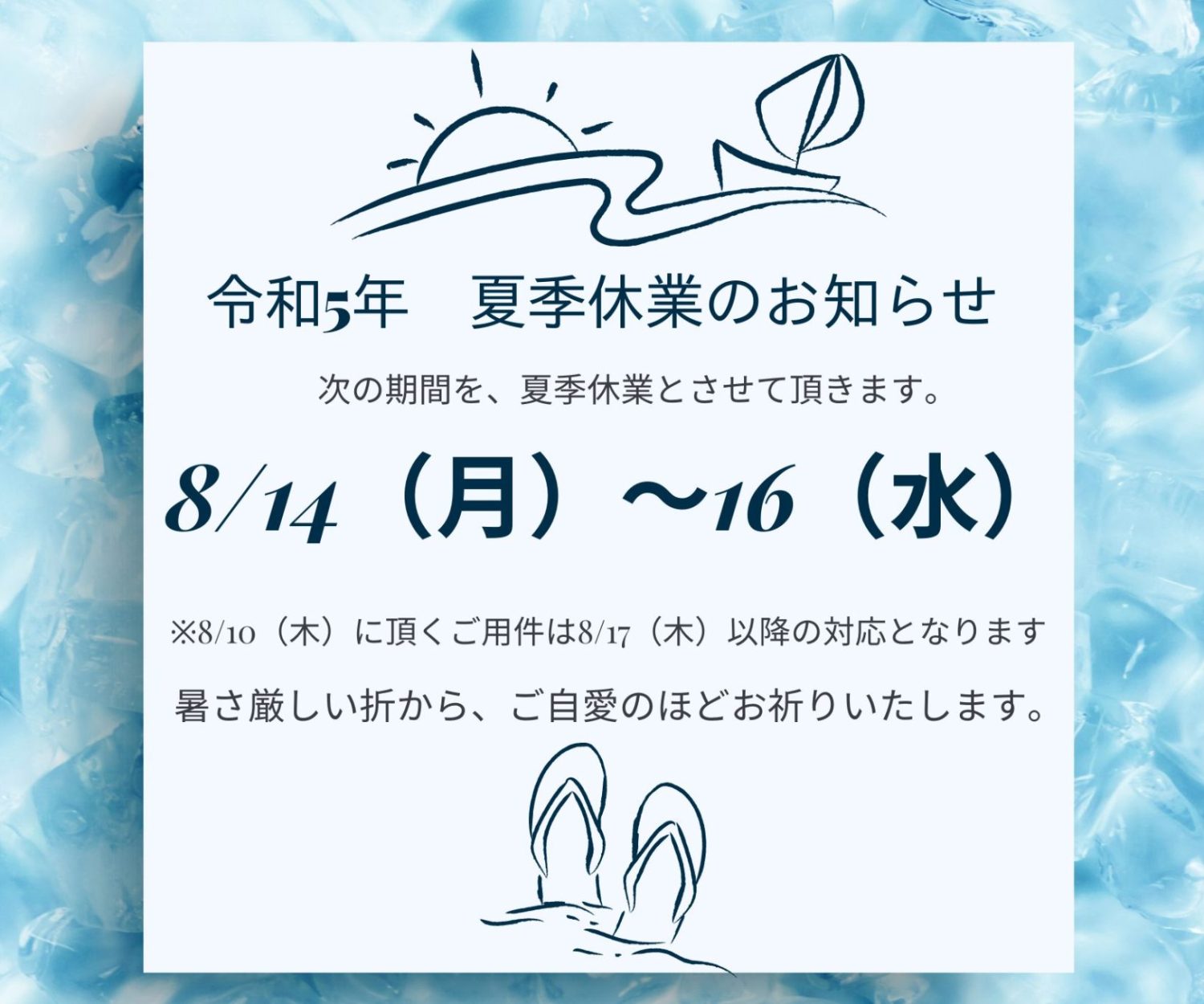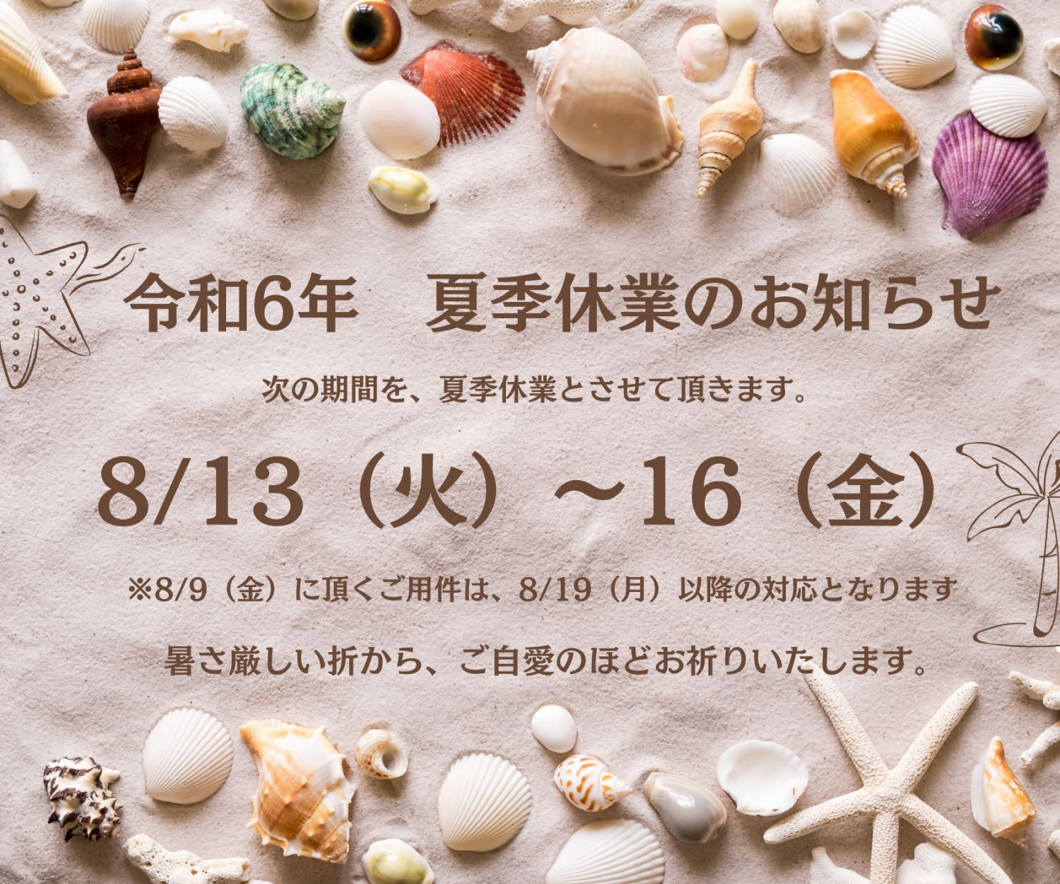 コラム, ニュース, 相続を知るコラム 夏季休業のお知らせ R7 25 7月 2025 夏季休業のお知らせ令和7年8月12日(火)~15日(金)を、夏季休業とさせていただきます。(8/8(金)以降に頂くご用件は、8/18(月)以降のご対応とさせていただきます。) 飯野悠美子