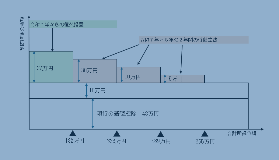 基礎控除とは? 基礎控除と合計所得金額 所得税の基礎控除をご存じでしょうか?給与の天引きの税金を含む、所得税について、ほとんどの人に関係する控除です。 基礎控除は、納税者自身の控除額で、令和6年は、通常48万円です。この金額が税金の計算上引かれて計算されています。 合計所得金額(収入金額とは異なります)が2,400万円超の人は基礎控除が減っていきますが、ほとんどの人には関係ないので今回はいったん無視します。 合計所得金額の正確な理解は、非常に複雑となりますので、今回はそういった所得があるという理解で十分だと思います。 どう変わる? 令和7年の税制改正により、基礎控除が、合計所得金額に応じて増える予定です。 重要なポイントは、基礎控除が、合計所得金額に応じて増えることが予定されているということです。 まず、合計所得金額2,350万円以下の人について、基礎控除額に10万円を加算し、48万円から58万円になります。これが基本となります。 これに加えて、さらに次のように基礎控除に加算されます。 1 合計所得金額132万円以下の人について、基礎控除額に37万円加算し、58万円+37万円=95万円となります。 2 合計所得金額132万円超336万円以下の人について、基礎控除額に30万円加算し、58万円+30万円=88万円となります。 3 合計所得金額336万円超489万円以下の人について、基礎控除額に10万円加算し、58万円+10万円=68万円となります。 4 合計所得金額489万円超655万円以下の人について、基礎控除額に5万円加算し、58万円+5万円=63万円となります。 注意するポイント 恒久措置と時限立法 上述の1については恒久措置、つまり、ずっと続くルールであるのに対し、2~4については令和7年と令和8年の2年間だけの時限立法、つまり、いまのところ2年間だけの限定的なルールとなっている点です。1に該当する人にとってはずっと続くルールとして安心して捉えていただき、2~4に該当する人は、いまのところ2年だけの限定的なルールだということをおさえておきましょう。 …